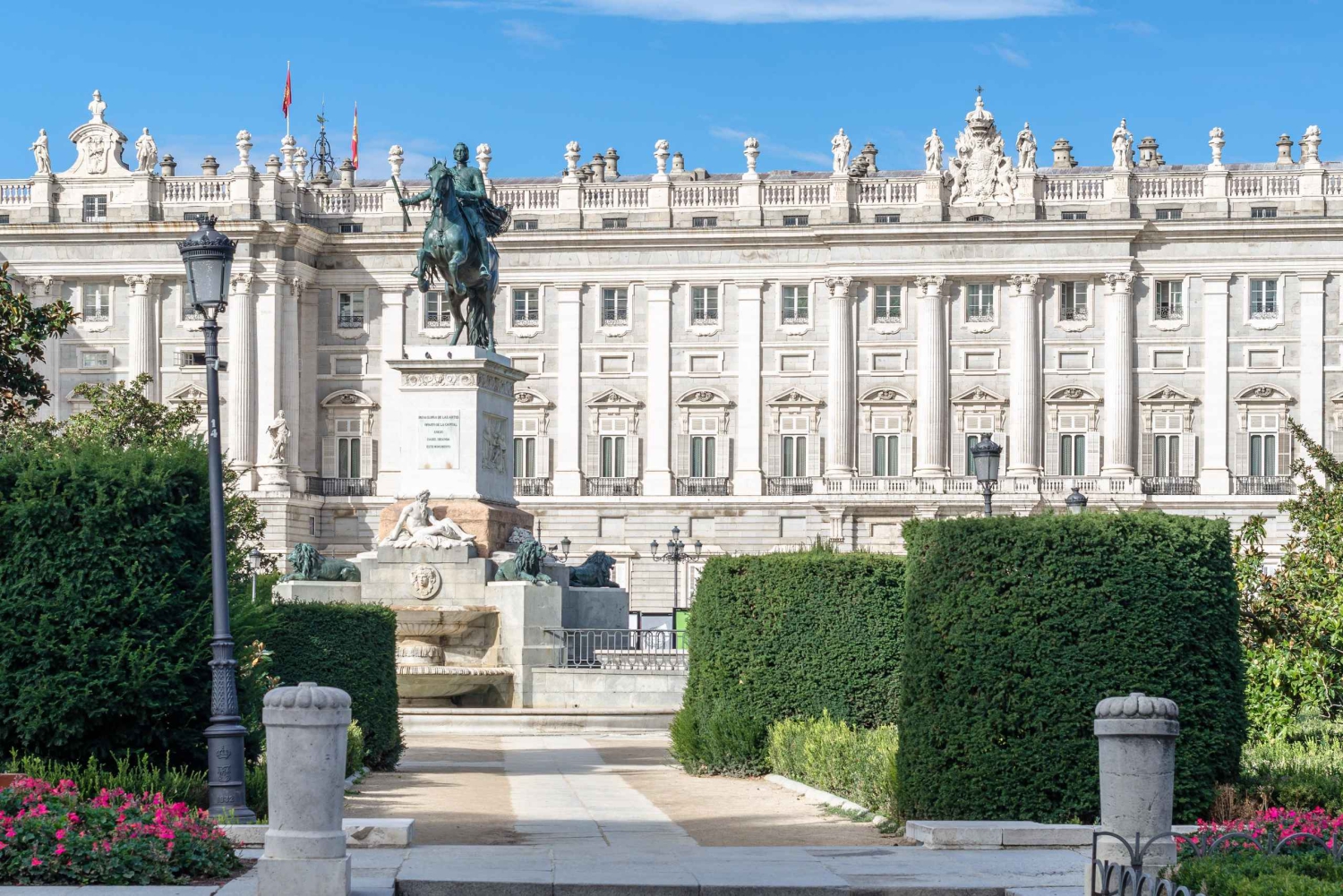- At the meeting point, please stand at the equestrian monument to Philip IV (Palacio de Oriente, opposite the main entrance to the Royal Palace). The entry ticket to the Royal Palace is included in the price of the activity. Customers will avoid queues when entering the Palace.