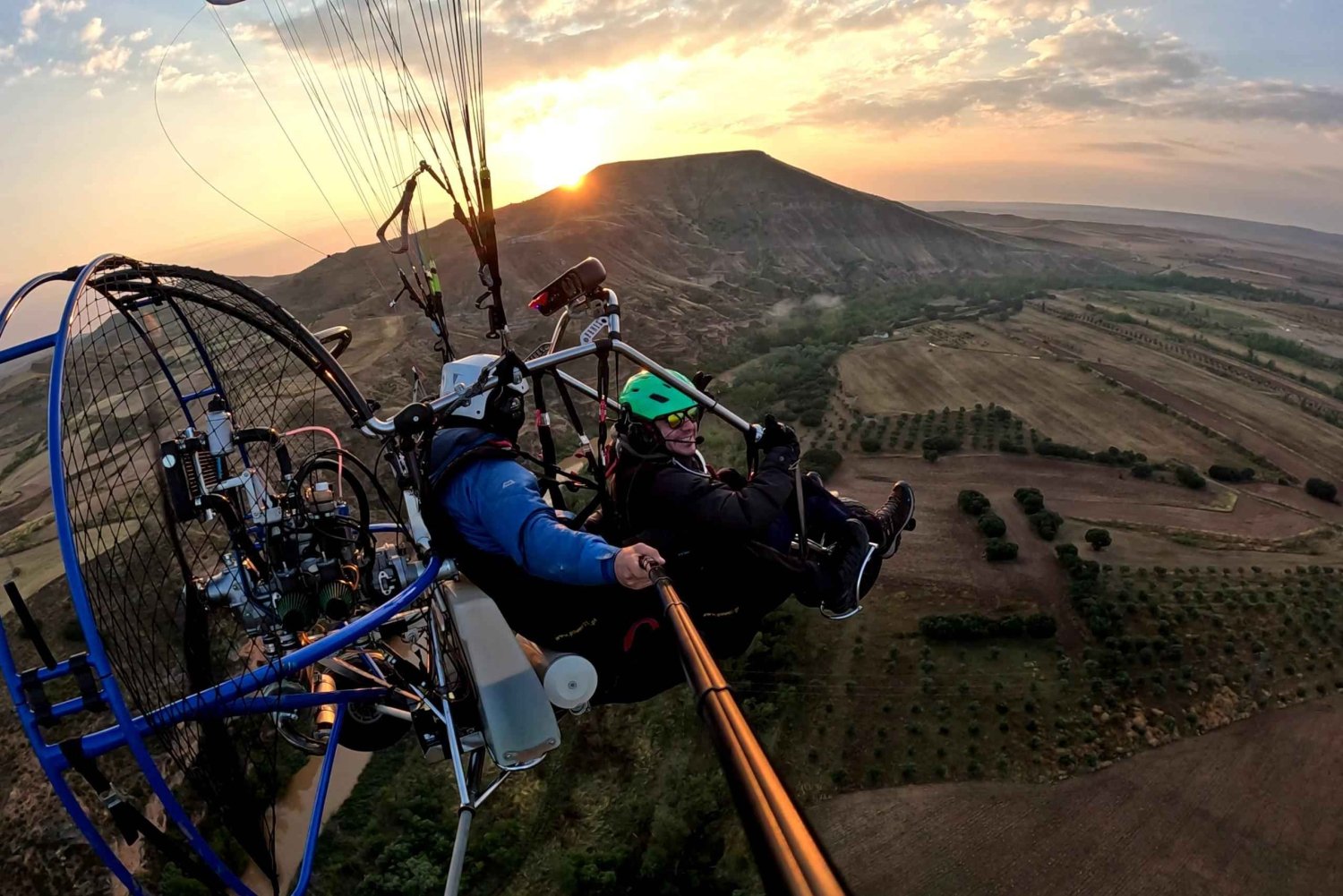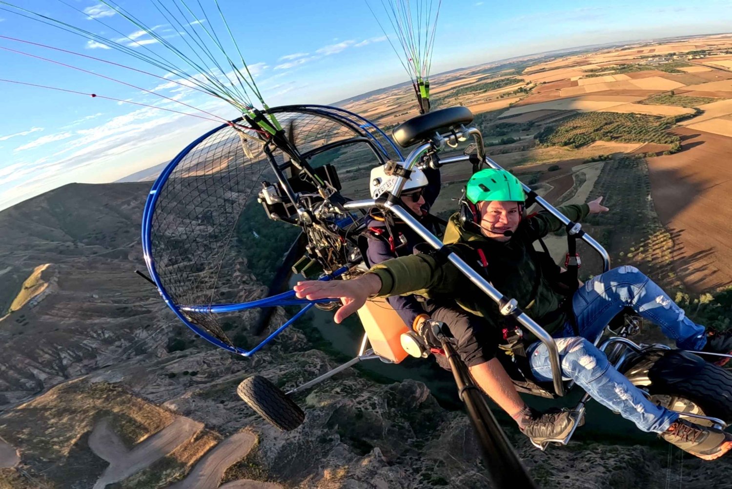 平坦な地形から離陸し、エナーレス川渓谷などのユニークな場所へ飛行します。飛行時間は30分または60分からお選びいただけます。 パラモーター飛行エリアは、アラリーリャ(グアダラハラ)にございます。マドリードからも近い、フライトを自由に楽しめるユニークな場所です。その名の通り、この山は非常に奇妙な形をしています。頂上は平坦で、4つの側面が急斜面になっているため、年間を通じて飛行するのに最適な空間となっています。 経験豊富なパイロットが安全を確保証し、飛行する壮大な周囲の環境についてご説明いたします。フライトには保険と必要なすべての装備が含まれています。 経験は必要ありません。パイロットが安全を確保し、飛行する壮大な環境についてご説明いたします。Includes