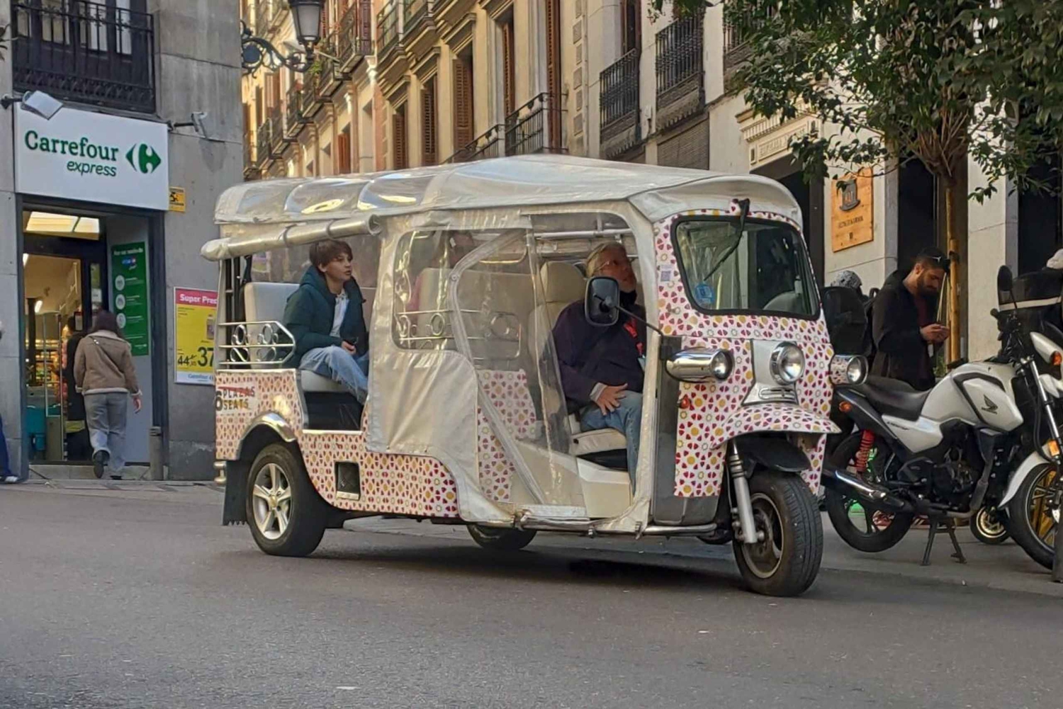 De beste manier om de stad, haar geschiedenis, haar verhalen, haar monumenten en prachtige bezienswaardigheden te leren kennen, is comfortabel aan boord van een van onze ecologische tuk tuks en met een gids die je rondleiding onvergetelijk zal maken. Op elke hoek en in elk steegje hebben onze meertalige gidsen een nieuwe verrassing om je te laten zien. In feite is de stad niet alleen wat er in boeken staat, maar wat er in het dagelijks leven en in de harten van echte 'Madrileños' leeft. Verken de wijken van Madrid en ontdek verschillende sferen, parken en bouwstijlen. Je zult verbaasd zijn over hoeveel de stad van straat tot straat kan veranderen! Van het historische 'Madrid de los Austrias' tot de multiculturele smeltkroes van La Latina, van de winkels in de wijk Salamanca tot la Gran via. Madrid is een diverse stad met 21 wijken. Elke wijk heeft zijn eigen sfeer, kom en geniet met ons van deze geweldige stad in een comfortabele tuk tuk, onze tours zijn geen gewone tours. Elke tour is ontworpen voor de verschillende interesses van onze gasten, op dit leuke en spannende avontuur door de stad.Includes